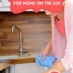the words 'spring cleaning tips for moms on the go' appear in a butterfly shape in coral above an image of a mom cleaning the dishes.
